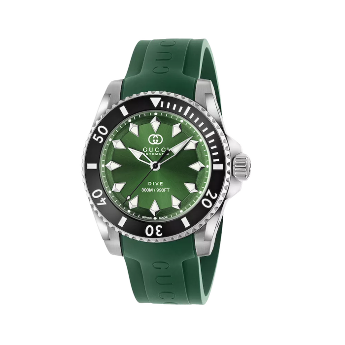 La linea Gucci Dive continua a reinterpretare i codici della Maison in modi contemporanei. Caratterizzato da una cassa in acciaio e un cinturino in gomma, questo orologio presenta un quadrante verde con l'emblematico logo Incrocio GG.