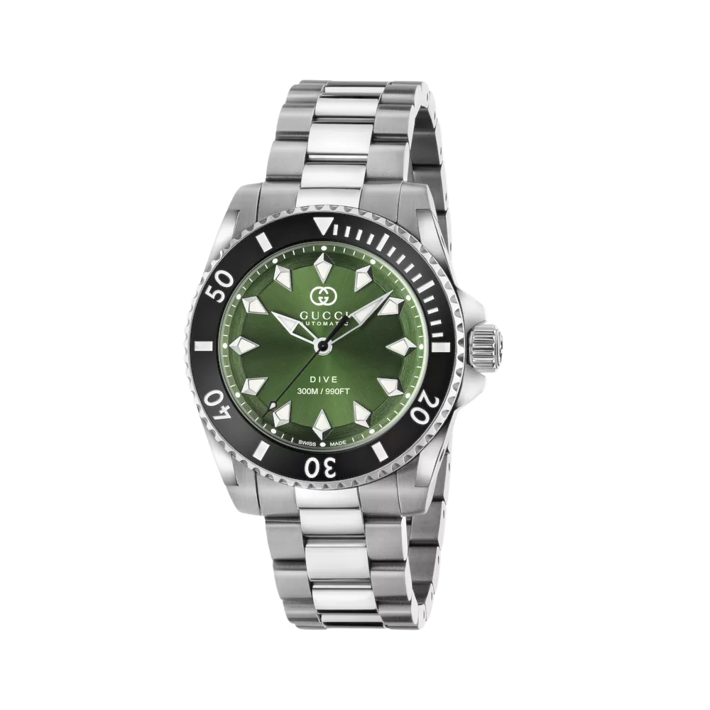 Cassa in acciaio inossidabile da 40 mm, quadrante verde con dettaglio G intrecciata e indici SuperLumiNova, lunetta in ceramica nera, bracciale in acciaio inossidabile