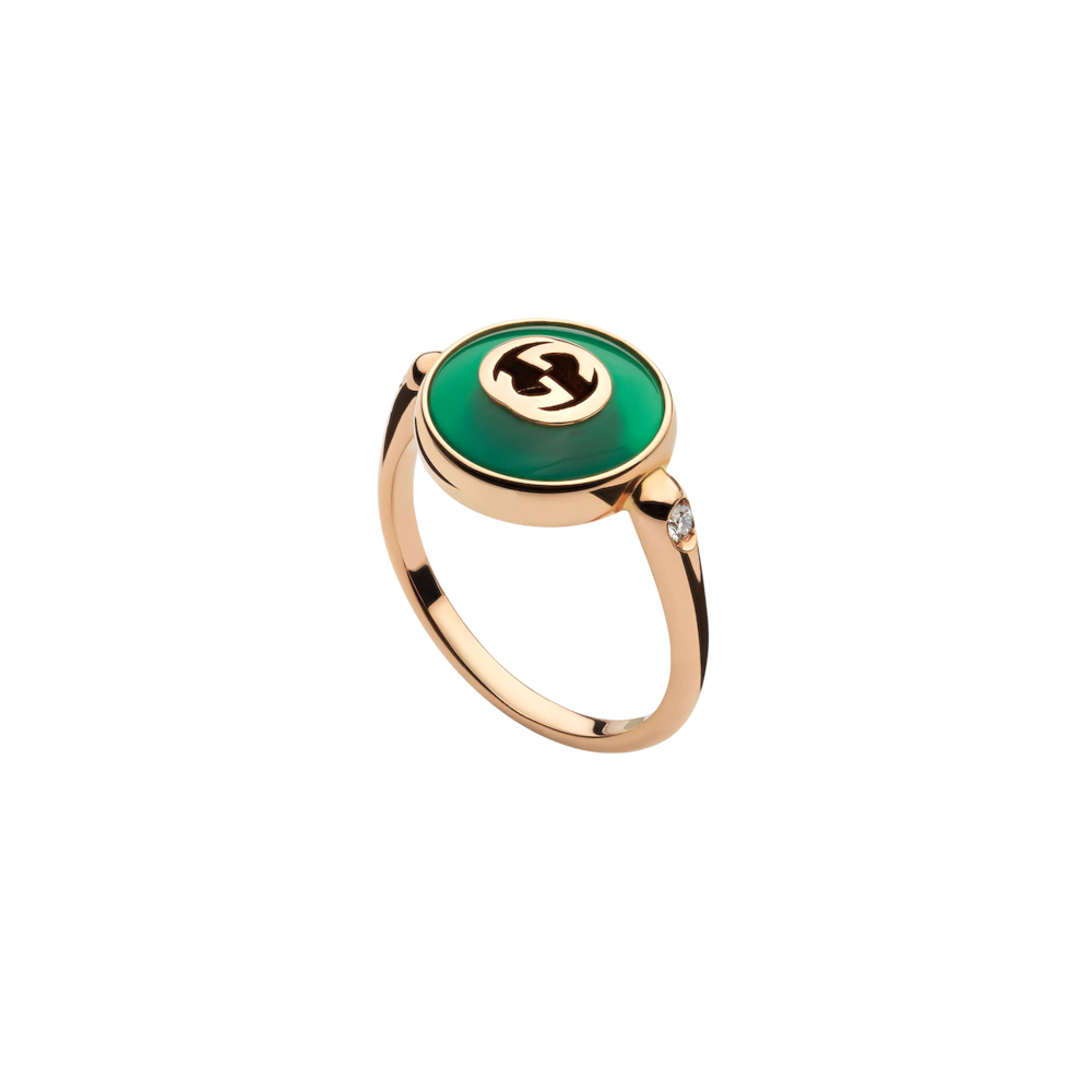 Il logo Incrocio GG è presentato in nuove ed eleganti versioni per la collezione Pre-Fall 2024. L'elegante oro rosa è completato da una vivace pietra di agata verde e da diamanti. Questo anello può essere indossato con altri accessori della stessa linea.