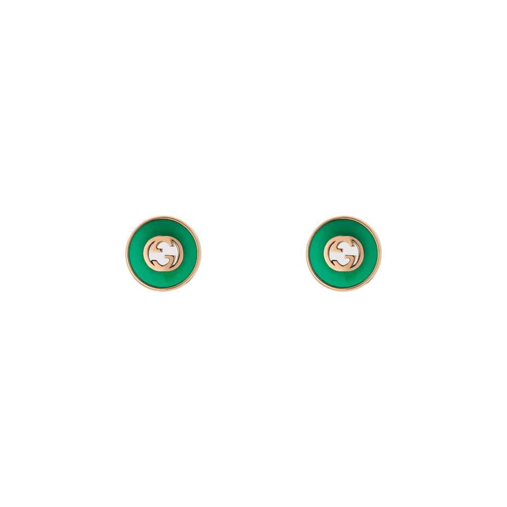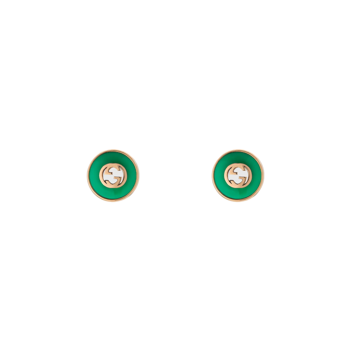 Il logo Incrocio GG è presentato in nuove ed eleganti versioni per la collezione Pre-Fall 2024. L'elegante oro rosa è completato da una vivace pietra di agata verde in questi orecchini a bottone con Incrocio GG. Il modello può essere indossato con altri accessori della stessa linea.