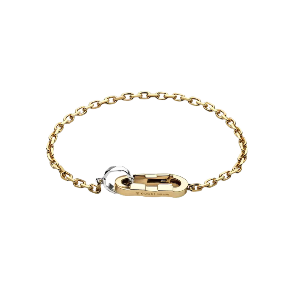 Nell'ambito della linea Gucci Link to Love, compare una nuova chiusura costituita da una maglia rettangolare incastrata con un piccolo cerchio. Elemento centrale di collane, orecchini e bracciali, questo moderno elemento di design rafforza il concetto di unione. In questo caso, il dettaglio definisce un bracciale a catena in prezioso oro giallo e bianco.