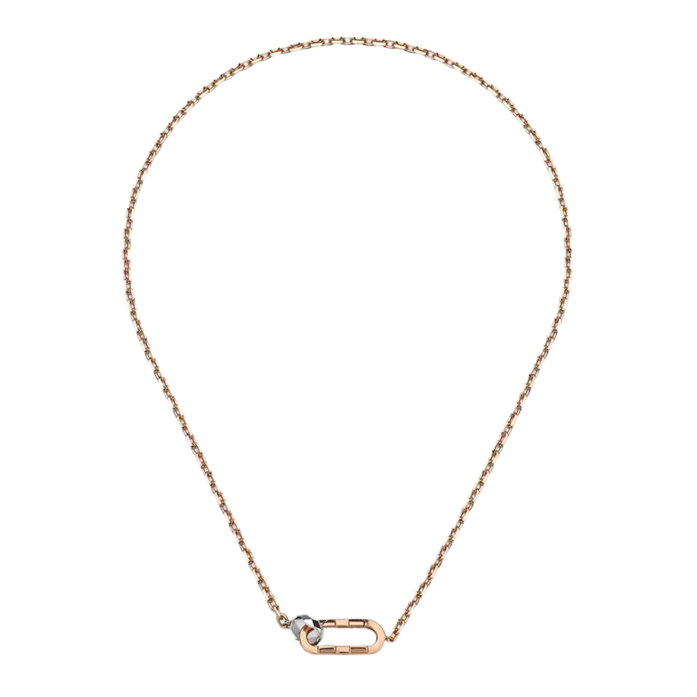 Nell'ambito della linea Gucci Link to Love, compare una nuova chiusura costituita da una maglia rettangolare incastrata con un piccolo cerchio. Elemento centrale di collane, orecchini e bracciali, questo moderno elemento di design rafforza il concetto di unione. In questo caso, il dettaglio definisce una collana a catena come parte della chiusura in prezioso oro rosa e bianco.