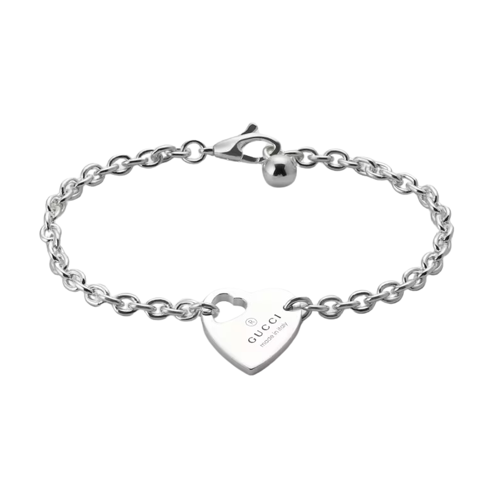 La linea Gucci Trademark unisce motivi e dettagli esagonali con il nome della Maison. Dal cuore cut-out al lucchetto, simboli divertenti continuano a caratterizzare una selezione di anelli, collane, bracciali e orecchini per la collezione Pre-Fall 2024. Questo bracciale a catena è ornato da un cuore che contiene al suo interno un dettaglio cut-out, anch'esso a forma di cuore.