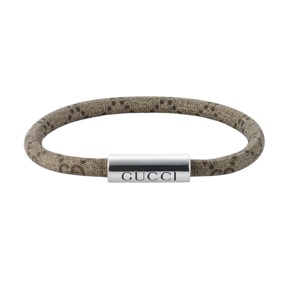 Gucci fa rivivere il suo logo trademark su targhette in argento, richiamando lo spirito moderno degli anni '90. I bracciali proposti in tessuto GG Supreme beige ed ebano offrono un'alternativa alla linea di gioielli da indossare tutti i giorni.
