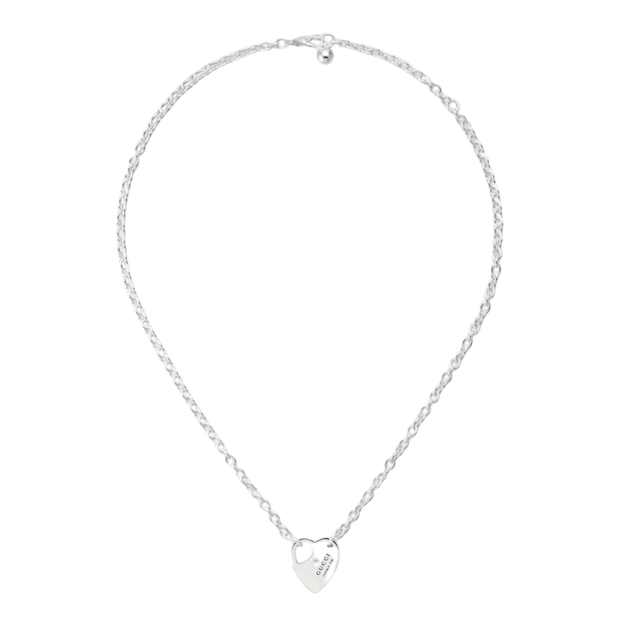 La linea Gucci Trademark unisce motivi e dettagli esagonali con il nome della Maison. Dal cuore cut-out al lucchetto, simboli divertenti continuano a caratterizzare una selezione di anelli, collane, bracciali e orecchini per la collezione Pre-Fall 2024. Questa collana a catena presenta un dettaglio cuore cut-out all'interno del pendente, anch'esso a forma di cuore.