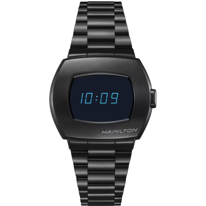 La storia iniziata con l’invenzione del primo orologio digitale al mondo nel 1970 continua grazie a questa raffinata versione total-black dell’iconico Hamilton PSR Digital quartz. Con un display digitale ibrido LCD e OLED, i numeri color blu possono essere letti con un solo sguardo durante il giorno e premendo un pulsante di notte.