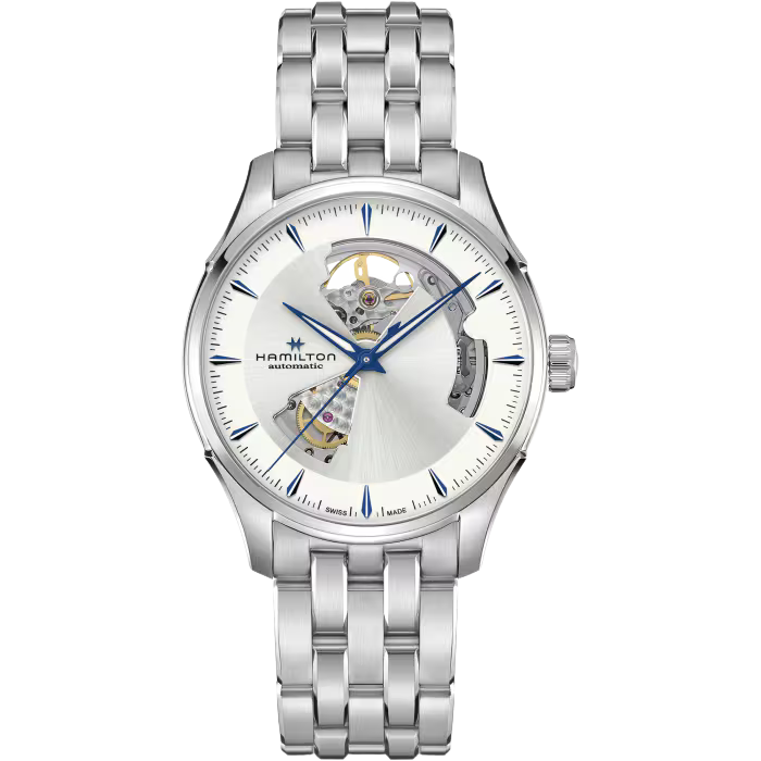 L'orologeria classica incontra il design contemporaneo in questo Jazzmaster Open Heart Automatic blu e argento. Le precise traforature del quadrante da 40 mm permettono di ammirare il movimento interno prodotto in Svizzera e donano a questo segnatempo sofisticato grande personalità.