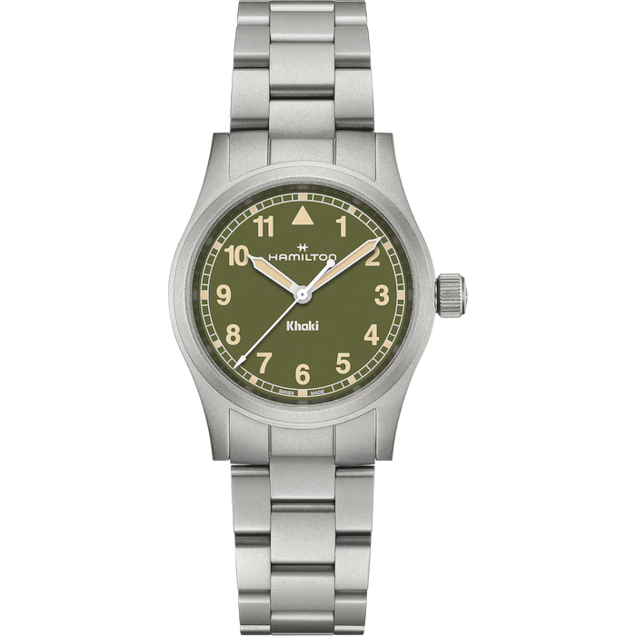 Perfetto per le tue avventure, il Khaki Field Quartz è un compagno affidabile e resistente, pronto per ogni esplorazione. Ispirato alla tradizione di precisione, innovazione e design funzionale di Hamilton, il Khaki Field Quartz combina un quadrante verde khaki da 33 mm con un moderno bracciale in metallo, offrendo uno stile intramontabile.