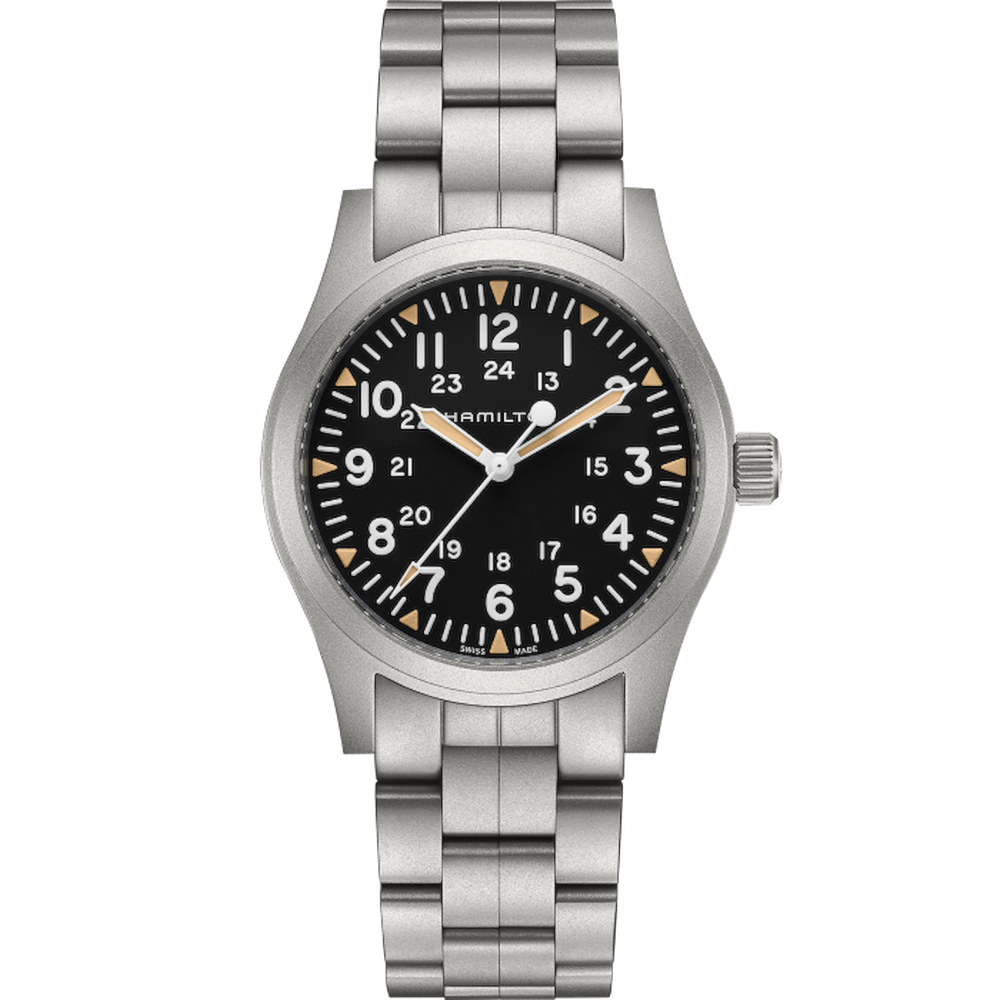 Uno dei segnatempo più iconici di Hamilton è ora disponibile con una cassa più grande. Animato dall’esclusivo movimento a carica manuale H-50, il Khaki Field Mechanical 42 mm conserva la forma originale con una cassa in acciaio con finitura sabbiata e quadrante facilmente leggibile in bianco o nero. Abbinata ad un comodo bracciale in acciaio o ad un cinturino NATO in tessuto verde, questa versione rivisitata di un orologio militare dal design robusto e resistente non ti farà perdere nessuna avventura.