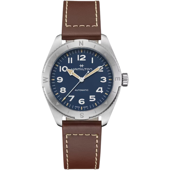 Preparati per un’avventura all’aria aperta con il Khaki Field Expedition, un orologio ideale per tutte le attività outdoor con un design a bussola, che ti permetterà, durante le escursioni, di orientarti con l'aiuto del sole. Racchiuso in una cassa in acciaio da 41 mm corredata da un cinturino in pelle marrone, questo orologio è dotato di corona a vite per proteggere il movimento in qualunque condizione atmosferica. Dotato di un quadrante blu testurizzato con rivestimento in Super-LumiNova® per una leggibilità eccezionale, il Khaki Field Expedition possiede tutta la robustezza di cui hai bisogno.