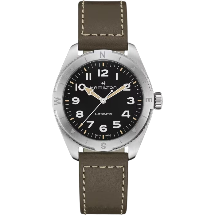 Preparati per un’avventura all’aria aperta con il Khaki Field Expedition, un orologio ideale per tutte le attività outdoor con un design a bussola, che ti permetterà, durante le escursioni, di orientarti con l'aiuto del sole. Racchiuso in una cassa in acciaio da 41 mm corredata da un cinturino in pelle verde, questo orologio è dotato di corona a vite per proteggere il movimento in qualunque condizione atmosferica. Dotato di un quadrante nero testurizzato con rivestimento in Super-LumiNova® per una leggibilità eccezionale, il Khaki Field Expedition possiede tutta la robustezza di cui hai bisogno.