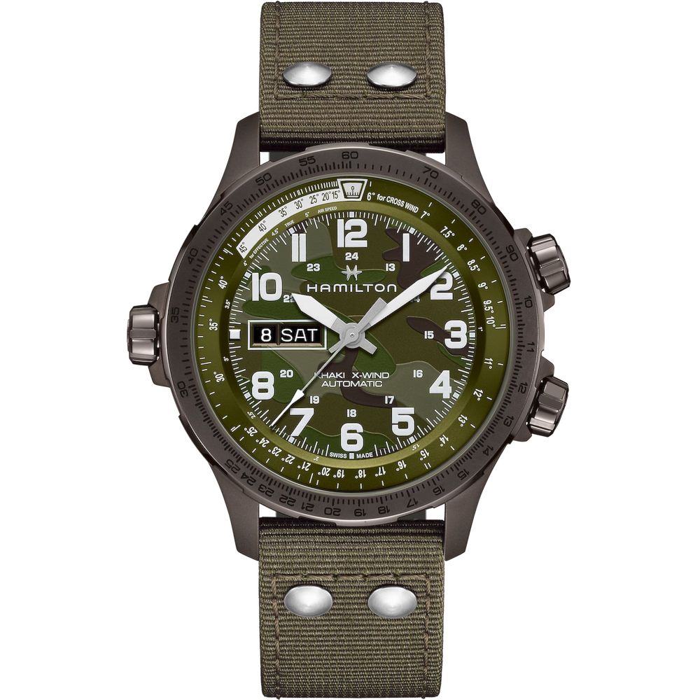 Progettato pensando ai piloti e costruito per le avventure in cielo, il Khaki Aviation X-Wind Day Date Automatic vola attraverso i venti trasversali con un nuovo quadrante con motivo mimetico abbinato ad una cassa marrone con rivestimento in PVD e cinturino in tessuto verde. Dotato di lunetta girevole interna e datario a ore 9, questo modello ad elevate prestazioni mostra uno stile deciso e moderno.