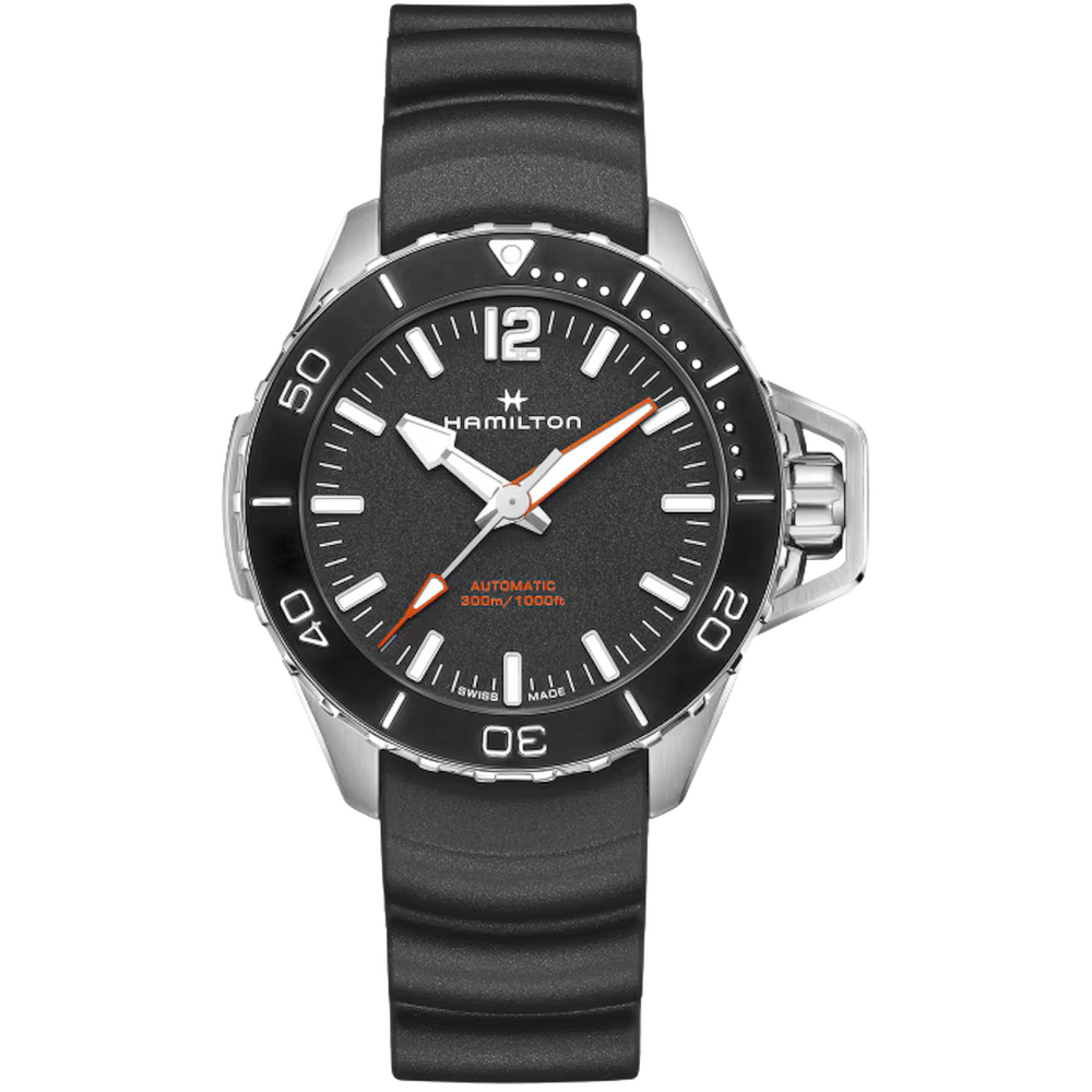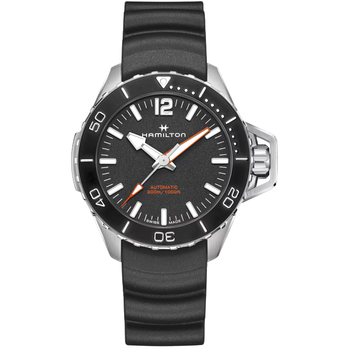 Con un nuovo look audace, il Khaki Navy Frogman Automatic è l’orologio Hamilton tecnicamente migliore per le avventure in mare. Progettato per garantire precisione, leggibilità e resistenza, porta l’insondabile potenza dell’oceano al polso. È inoltre dotato di una protezione della corona dalla forma unica, e di un cinturino in caucciù ondulato.