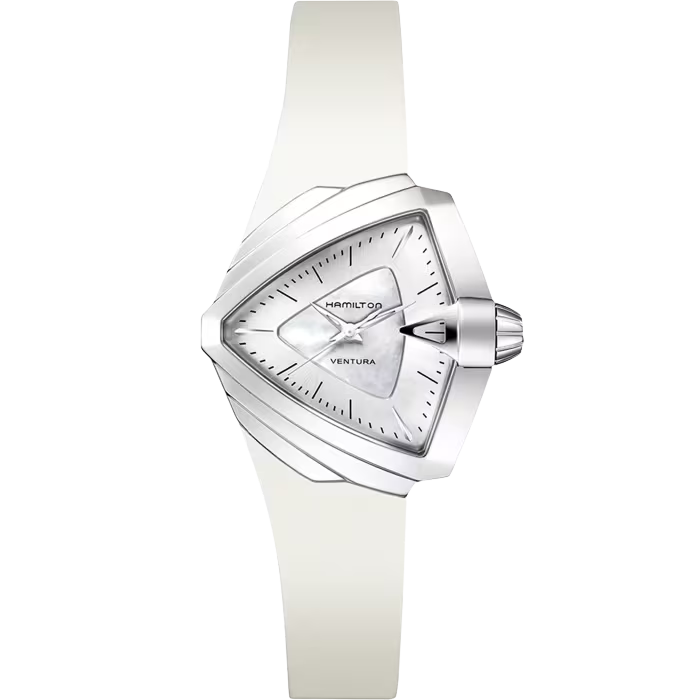 Il Ventura originale, presentato nel 1957, passò alla storia dell'orologeria come il primo orologio elettrico a batteria al mondo. Con il suo design unico e audace, divenne rapidamente un'icona e un oggetto da collezione. L'ultima interpretazione del Ventura è un fedele tributo all'originale e richiama la pionieristica forma a scudo della cassa, esempio di design moderno "Mid-Century". Questa versione bianca e madreperla, piccola ma dalle proporzioni perfette, è stata progettata per donne dalla forte personalità.