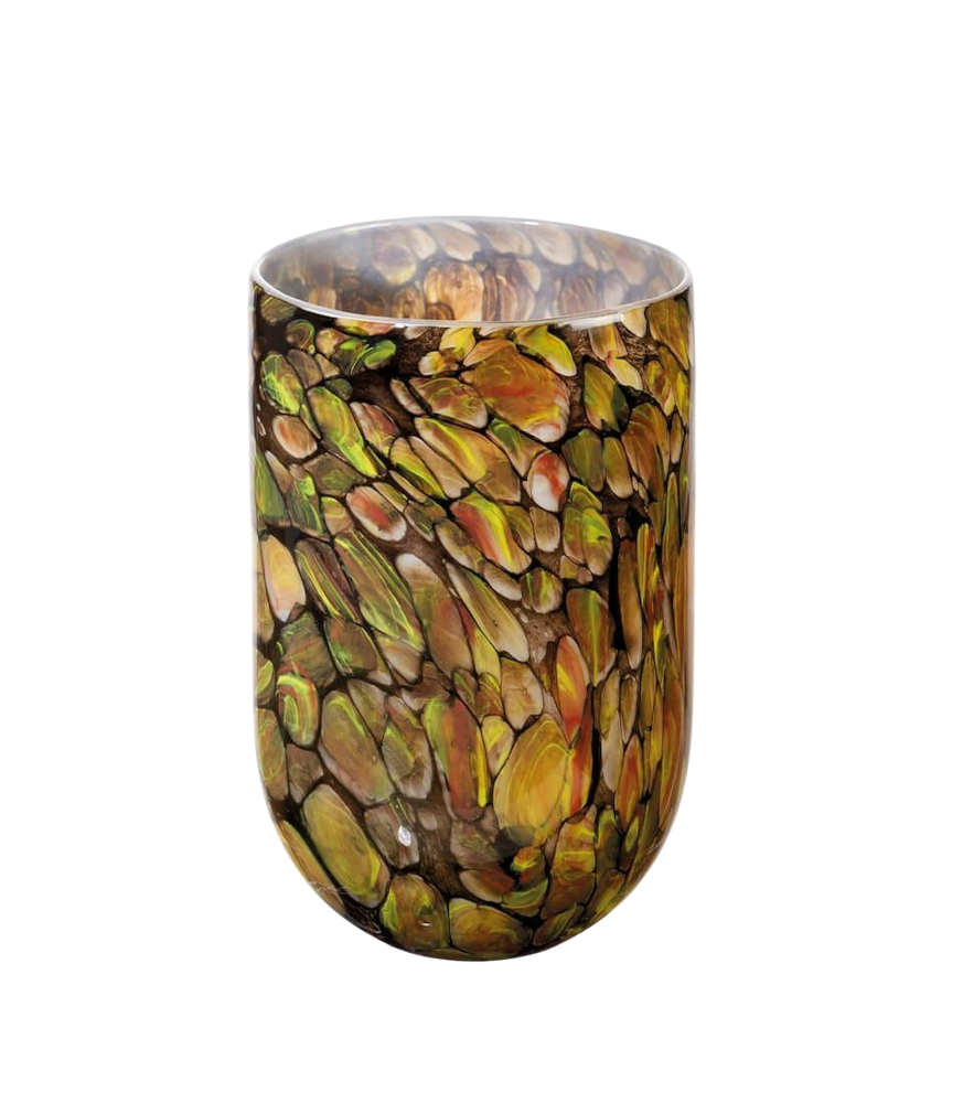 Vaso basso in vetro colorato. Tonalità della terra e un originale decoro, che rievoca pattern animalier, lo rendono un complemento d'arredo dallo stile moderno ed eclettico. Da abbinare al vaso medio e al vaso alto coordinati dell'ispirazione Ethno Chic per un living con complementi che si armonizzano perfettamente tra di loro.