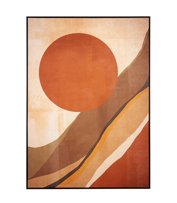 Quadro con cornice realizzato con la tecnica della serigrafia su tela. Un contemporaneo paesaggio dalle linee essenziali e stilizzate. Colori decisi e intensi richiamano le nuance calde della natura. Un complemento d'arredo che renderà i vostri ambienti eleganti e accoglienti.