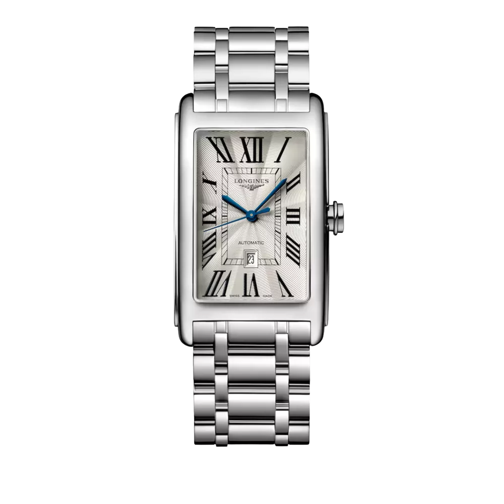 Orologio Longines DolceVita automatico con cassa in acciaio inossidabile da 28,2 x 47 mm, quadrante argento flinqué con datario, movimento meccanico a carica automatica con frequenza di 28.800 alternanze/ora e riserva di carica di circa 45 ore. Vetro zaffiro antigraffio, impermeabile fino a 3 bar, bracciale in acciaio con chiusura déployante a tripla sicurezza e apertura a pressione.