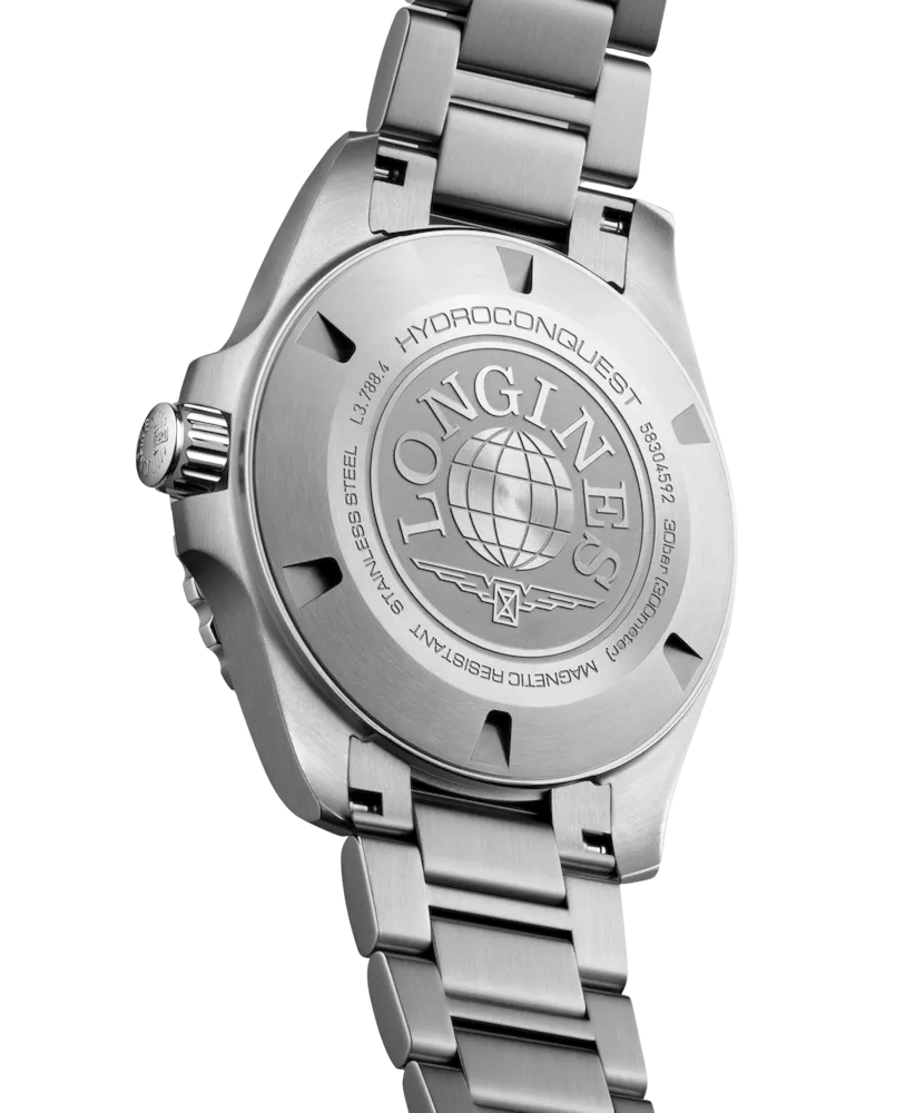 Longines HydroConquest automatico con cassa in acciaio inossidabile da 42 mm e lunetta in ceramica, quadrante nero laccato lucido con indici luminescenti Swiss Super-LumiNova®, movimento meccanico a carica automatica con frequenza di 25.200 alternanze orarie, riserva di carica di circa 72 ore e bilanciere-spirale in silicio monocristallino, corona a vite, lunetta girevole unidirezionale, vetro zaffiro antigraffio con trattamento antiriflesso multistrato, impermeabile fino a 30 bar, bracciale in acciaio inossidabile con doppia chiusura deployante di sicurezza e microregolazione.