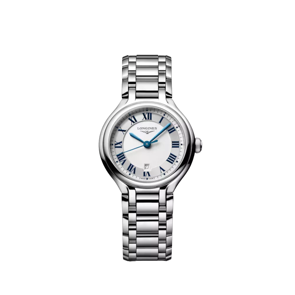 Longines PrimaLuna al quarzo con cassa in acciaio inossidabile Ø 30 mm, datario, quadrante argento soleil, vetro zaffiro antigraffio con trattamento antiriflesso multistrato su entrambi i lati, impermeabile fino a 3 bar, bracciale in acciaio con chiusura déployante a tripla sicurezza e apertura a pressione.