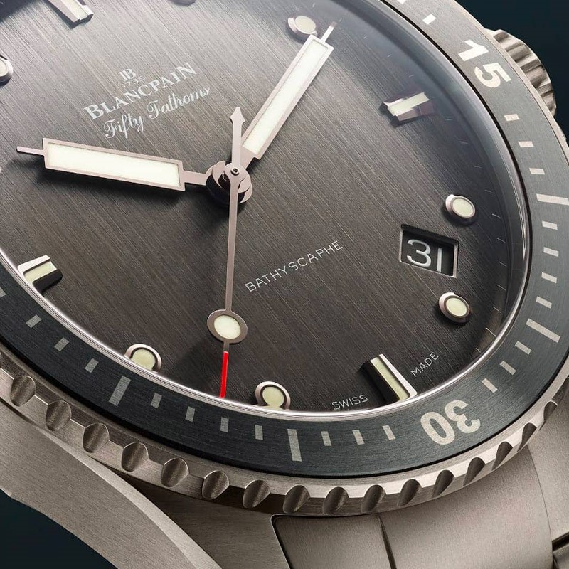Utilizzando l’ormai caratteristico profilo della cassa da 43 mm del Bathyscaphe, Blancpain ha nuovamente adattato l’orologio subacqueo introducendo una cassa in titanio grado 23 e completandola con un elegante quadrante grigio.