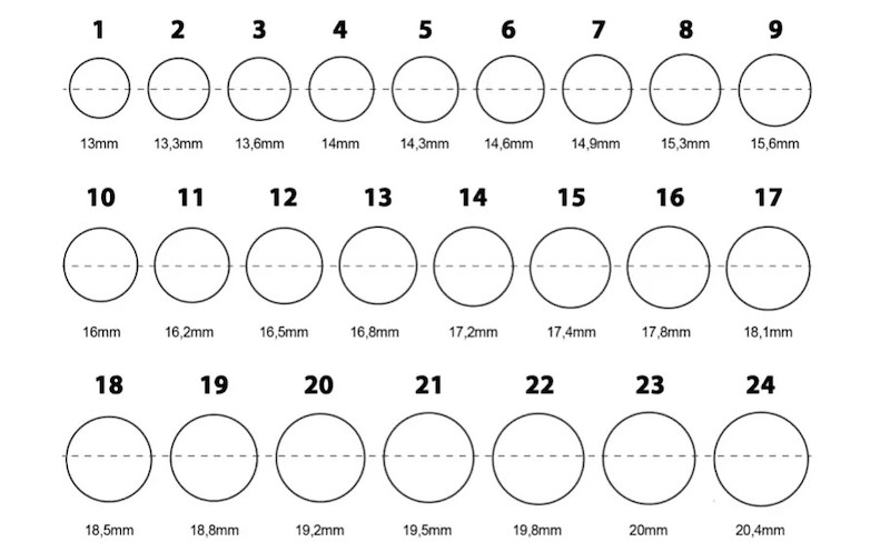 Confronta la misura che hai ottenuto con l’elenco che vedi di seguito per trovare la corrispondenza con l’anello.