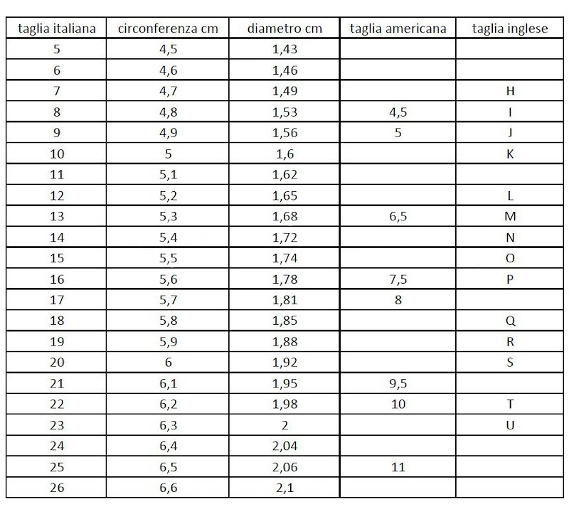 Quindi, se la circonferenza del dito è 5,5 cm la misura corretta sarà la 15.