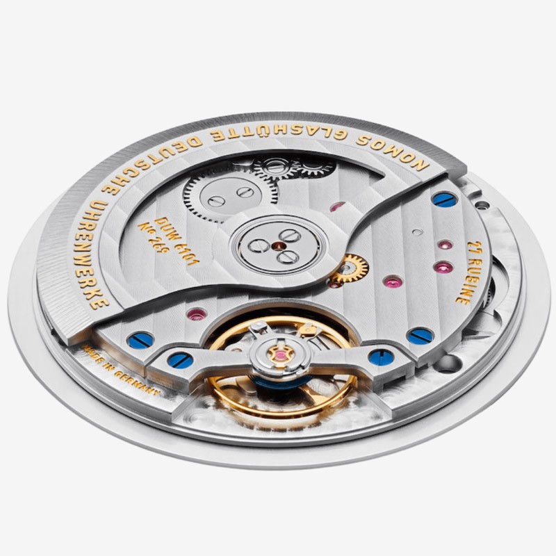 Con il secondo calibro, DUW 6101, NOMOS Glashütte ha compiuto un ulteriore passo in avanti, con un datario regolabile in modo semplice e veloce ed è dotato di uno speciale rotore. Può essere ruotato in entrambe le direzioni, senza quasi alcuna perdita di energia. Il suo angolo inverso è stato ridotto a soli 10 gradi, il minor valore possibile