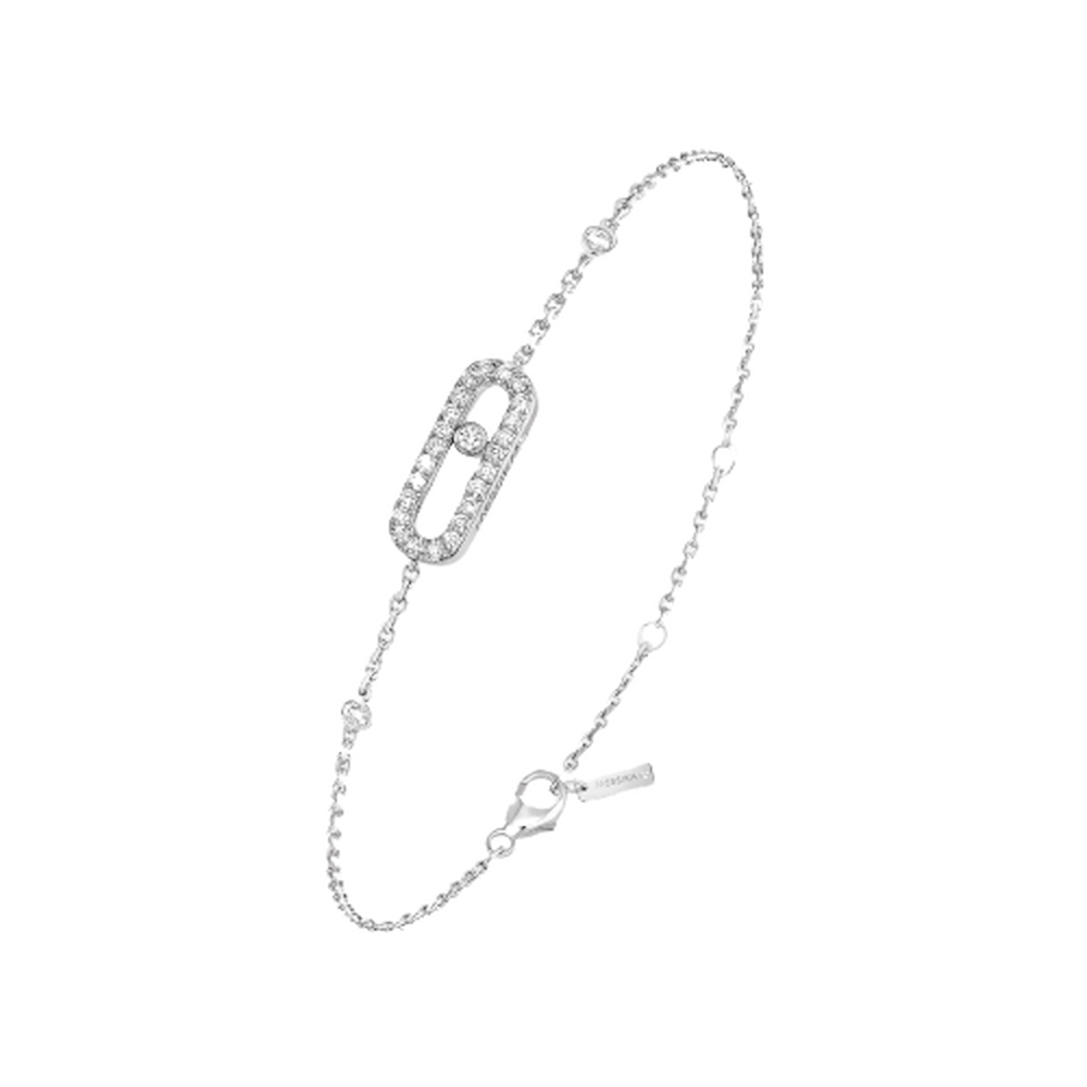 Questo bracciale in oro bianco 18 carati con pavé di diamanti, interamente realizzato a mano e incastonato con un diamante a taglio brillante, fa parte della collezione di gioielli di lusso Move, la firma di Messika House. La sua sottile catena è ornata dalla gabbia Move che sostiene un diamante incastonato che si muove e brilla secondo i gesti. Lo splendore dell'oro bianco illumina la purezza dei diamanti. Questo bracciale in oro bianco con pavé di diamanti può essere indossato da solo o impilato. Un dettaglio chic su questo braccialetto di lusso: i diamanti che adornano la catena. Amerai la radiosa eleganza di questo bracciale in oro bianco con pavé di diamanti. Scopri online tutte le collezioni di bracciali con diamanti di Messika!