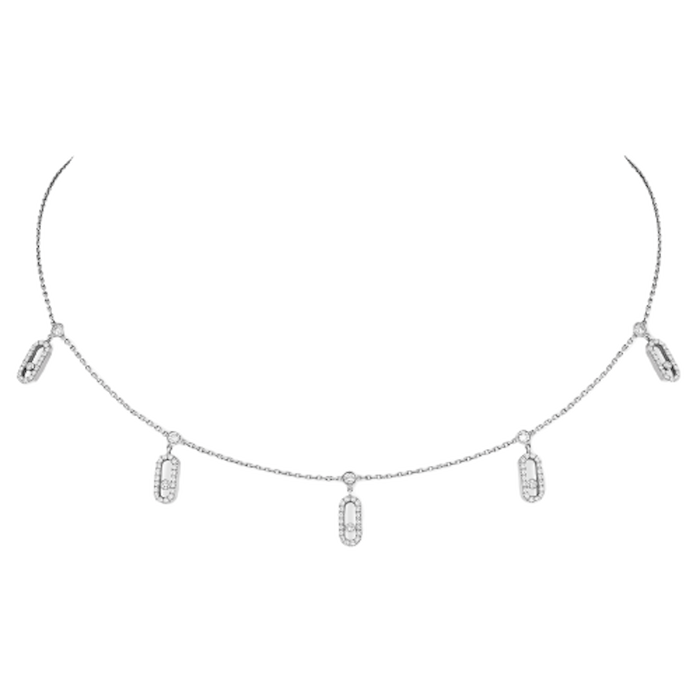 Cedi alla tentazione con la collana di diamanti con pendente a goccia Move Uno in oro bianco. È realizzato in oro bianco 18 carati ed è costituito da una sottile catena con 5 luminosi ciondoli di diamanti Move Uno. Un inno alla luce e allo splendore dei diamanti, la sua morbidezza e il movimento che lo definisce è irresistibile. Dotato di chiusura a moschettone con sistema scorrevole, puoi indossarlo come girocollo o collana girocollo.