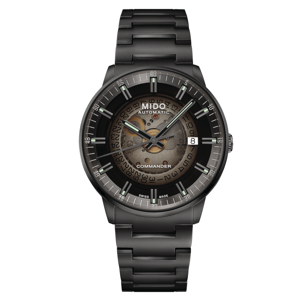 Con il Commander Gradient, il meccanismo dell'orologio diventa visibile grazie ad un quadrante in vetro acrilico trasparente, il primo di questa iconica collezione. I componenti del Calibro 80 in questo modo possono essere ammirati sia sul quadrante che sul retro, grazie ad un vetro trasparente presente sul retro cassa. Decorato con un originale motivo fumé sfumato, il quadrante diventa sempre più opaco intorno ai bordi mentre la data alle ore 3 spicca perfettamente sullo sfondo bianco dell'apertura.