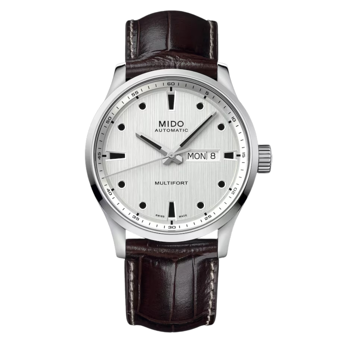 Sul quadrante sfumato del Multifort M, una finitura satinata verticale richiama le Côtes de Genève caratteristiche della collezione. L'immacolata Super-LumiNova® crea contrasto e leggibilità sulle lancette e sugli indici rotondi. La leggendaria robustezza del Multifort batte al ritmo del famoso Calibro 80. La sua riserva di carica fino a 80 ore è abbinata a una spirale in Nivachron™, un materiale rivoluzionario che offre una precisione formidabile. MIDO propone il Multifort M con un sistema di cambio del cinturino senza attrezzi, in versione acciaio o tessuto su base di gomma.