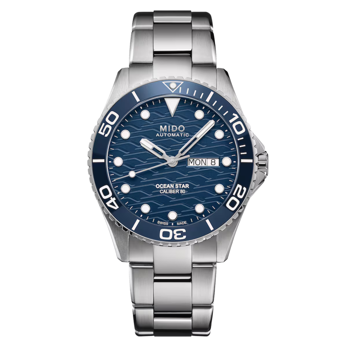Mido ha inserito la ceramica - un materiale eccezionale per l'orologeria - nella lunetta rotante unidirezionale del suo Ocean Star 200C. Il quadrante è decorato con un motivo ondulato e con indici applicati individualmente, ricoperti da pigmenti di Super-Luminova® bianca. Questo orologio subacqueo è resistente fino a 20 bar (200m), con una forma della cassa che permette una protezione extra per la corona a vite. Il fondello della cassa è inciso con il logo Ocean Star. Il movimento automatico, inoltre, ha un'autonomia fino a 80 ore di riserva di carica.