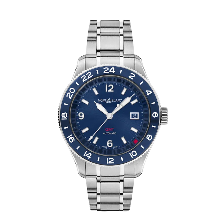 Laddove la maggior parte degli orologi GMT indica il secondo fuso orario con una lancetta aggiuntiva, il Montblanc 1858 GMT presenta un'indicazione GMT senza lancette molto intuitiva e altamente leggibile. Il Montblanc 1858 GMT indica il secondo fuso orario con un quadrato rosso che si sposta all'esterno del quadrante. Questo quadrato rosso è posizionato accanto a una lunetta fissa in alluminio anodizzato blu con un orologio di 24 ore. Questo sistema indica anche le mezz'ore. Altre funzioni includono una data e una lancetta centrale dei secondi. L'orologio è racchiuso in una cassa in acciaio inossidabile da 42 mm ed è dotato di un quadrante sunray blu e di un bracciale affusolato intercambiabile in acciaio inossidabile con regolazione fine per una calzata precisa. Un'incisione sul fondello mostra i continenti, gli oceani e i nomi delle città in ciascuno dei 24 fusi orari, offrendo un'indicazione dell'ora mondiale.