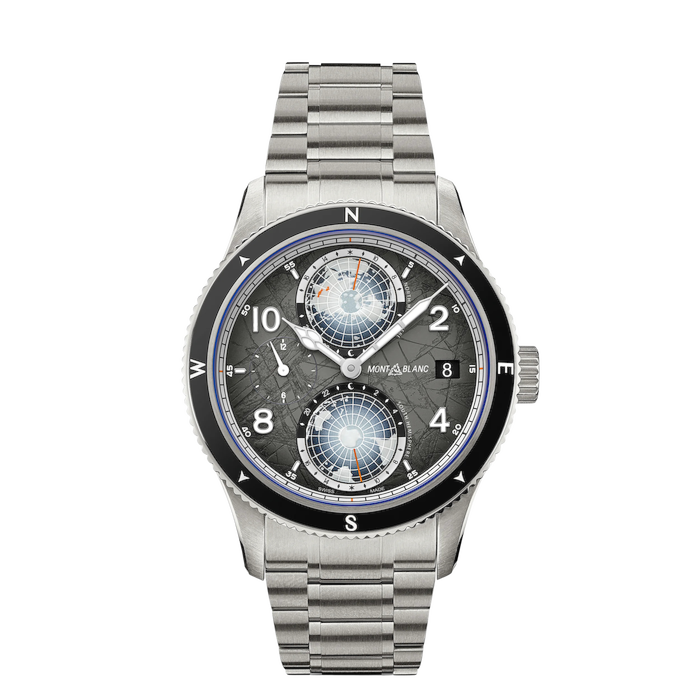 Rendendo omaggio alle vette più alte del mondo e agli alpinisti che osano scalarle resistendo a condizioni estreme, il Montblanc 1858 Geosphere Chronograph 0 Oxygen The 8000 è alloggiato in una cassa in titanio di 42 mm totalmente priva di ossigeno. Questa innovazione comporta diversi vantaggi per gli esploratori, in quanto elimina l'appannamento e previene l'ossidazione, consentendo ai componenti del movimento di durare più a lungo con una precisione ancora più accurata. Il segnatempo è animato dal movimento automatico di manifattura MB 29.25 con complicazione ora universale, che indica le ore dei 24 fusi orari leggibili sui continenti luminescenti dei globi tridimensionali dell'emisfero boreale e australe, le indicazioni giorno/notte, l’ora di due fusi orari e la data. L’orologio è inoltre dotato di una lunetta bidirezionale scanalata in ceramica nera con punti cardinali luminescenti, di un quadrante grigio scuro sfumato con motivo “ghiacciaio” e tocchi arancioni e di un bracciale intercambiabile in titanio con conicità e regolazioni raffinate. Il fondello di questo modello reca un’incisione laser in 3D del monte K2, raffigurato con colori, profondità e realismo incredibili.