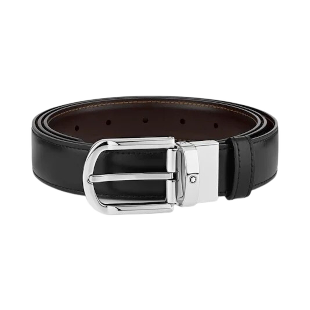 Fibbia ad ardiglione arrotondata a ferro di cavallo con sistema "revolving" finitura palladio lucido con emblema Montblanc. Cinghia in pelle reversibile nera e marrone, 3 cm x 120 cm.
