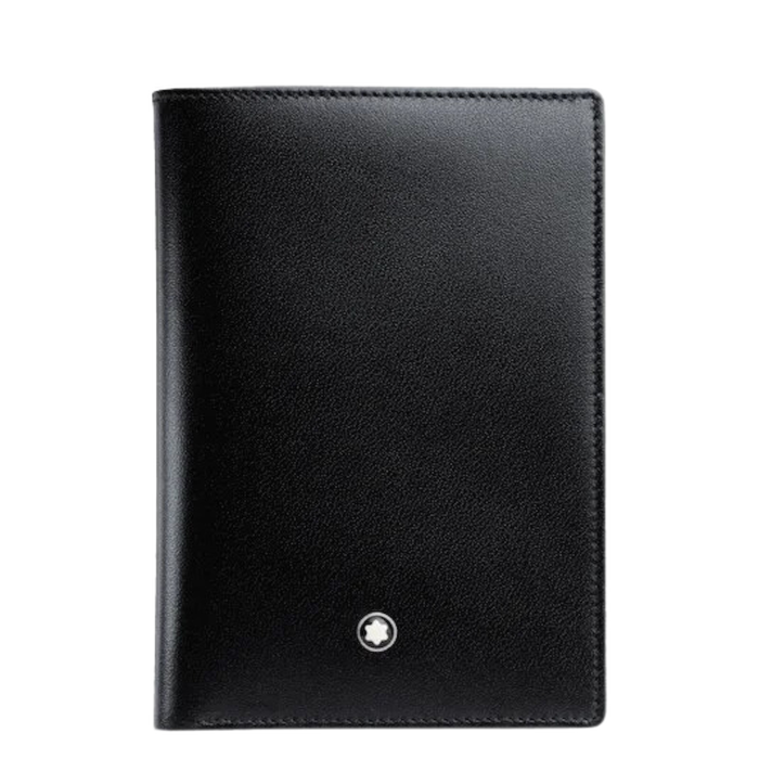 Portafoglio 4 scomparti in pelle di vitello pieno fiore europea, nero lucido esclusivo Montblanc, fodera jacquard con marchio Montblanc, emblema Montblanc con anello finitura palladio, 4 tasche per carte di credito, scomparto per banconote, 4 tasche extra.