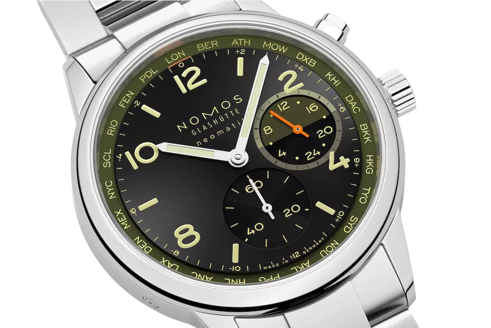 La serie Night Navigation di NOMOS celebra la vita notturna delle città del mondo; il modello Vector, con quadrante nero galvanizzato e dettagli verde oliva, indica contemporaneamente 24 fusi orari ed è dotato di sottoquadrante da 24 ore con indicatore giorno/notte. La referenza 790.S9 ha cassa in acciaio inossidabile con fondello e vetro zaffiro, vetro a cupola antiriflesso, movimento automatico, diametro 40 mm, spessore 9,9 mm, ansa 48 mm e impermeabilità 10 atm. Lancette placcate rodio con Superluminova ecru, edizione limitata a 175 esemplari con incisione dedicata.