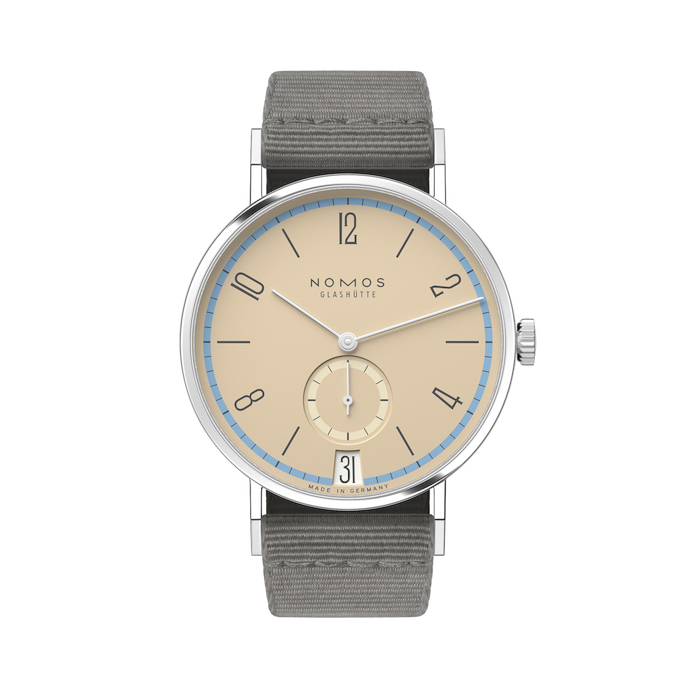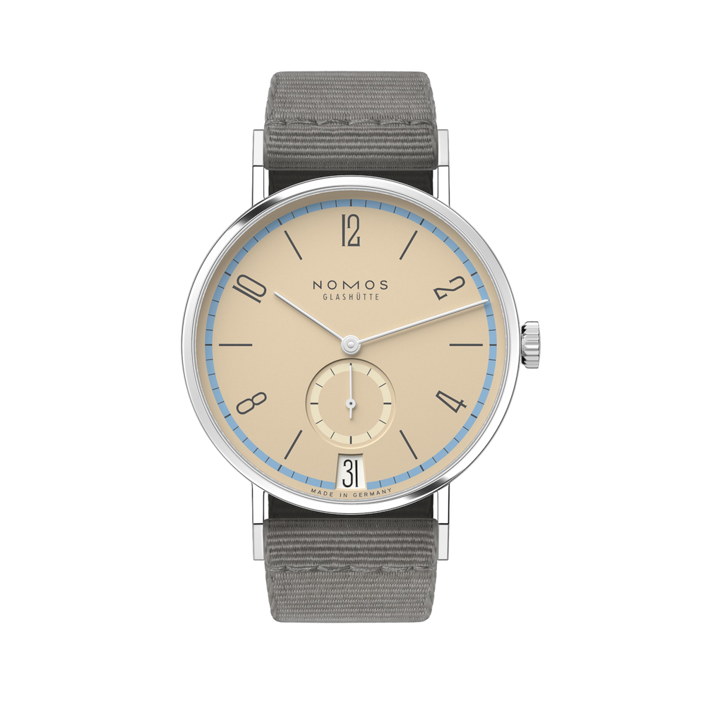 Il modello iconico NOMOS a colori. Pieno di energia e di complessità. Per questa edizione speciale di Tangente 38 datario a carica manuale, numerosi elementi del quadrante sono stati abbinati individualmente al carattere dell'orologio. 31 modelli speciali per ogni giorno del mese, 31 personalità differenti, con ogni versione limitata a 175 esemplari. Tangente datario Ariel rievoca luoghi lontani, il cielo aperto e la vastità dello spazio. Ma anche le fresche giornate primaverili, quando il cielo risplende dolcemente attraverso il lucernario. Un orologio in grado di esprimere la sua complessità su quasi ogni polso, dove appare calmo, appagato e intelligente.