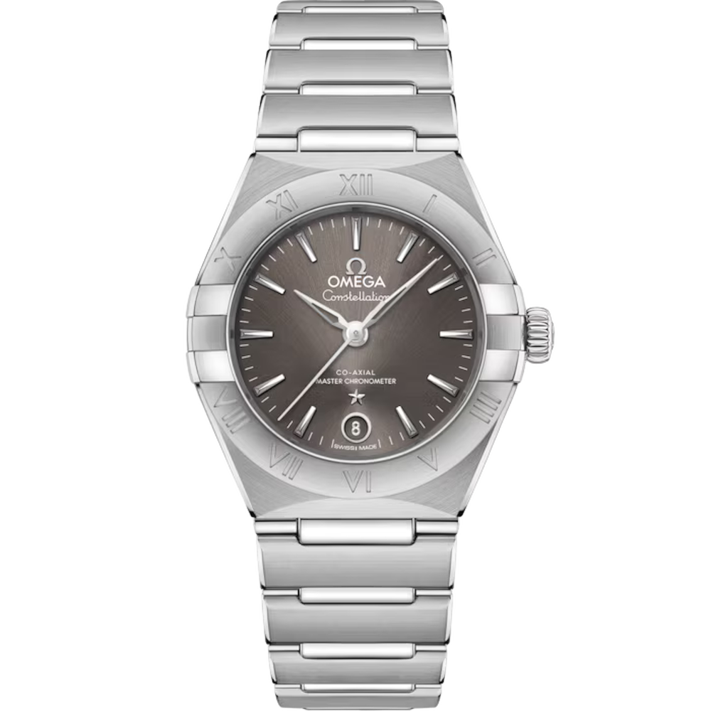 Questo modello da 29 mm in acciaio inossidabile presenta una lunetta con numeri romani incisi, un quadrante grigio con finitura spazzolata a raggi di sole e un datario a finestrella a ore 6. Le lancette, il logo OMEGA, la stella Constellation e gli indici sono in oro bianco 18K.