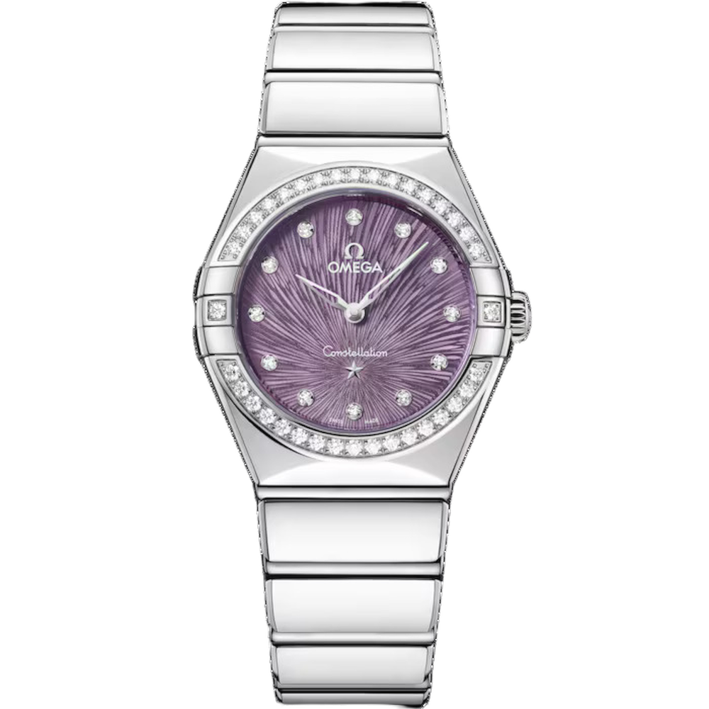 Questo modello da 28 mm, realizzato in acciaio inossidabile, è impreziosito da una scintillante lunetta tempestata di diamanti. Il quadrante con trattamento PVD viola, ornato dall’iconico motivo Supernova inciso elettrochimicamente, presenta lancette e stella in oro bianco 18K, e indici delle ore con diamanti incastonati in supporti in oro bianco 18K.