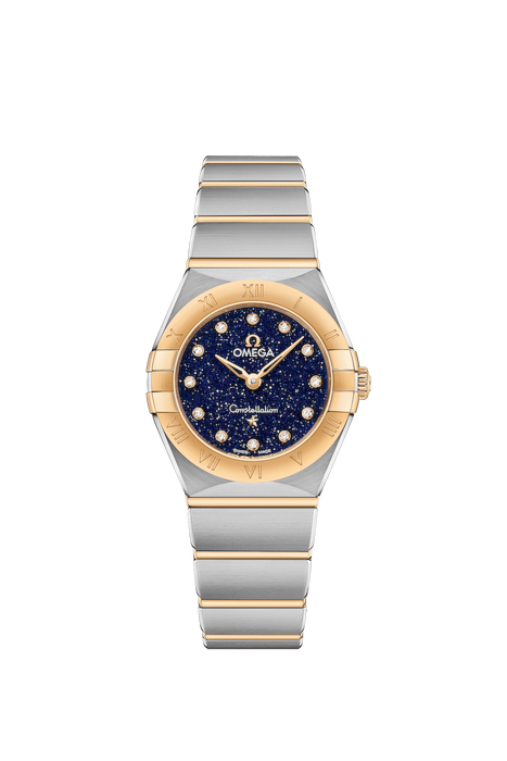 Questo modello da 25 mm in oro giallo 18K e acciaio inossidabile presenta una lunetta con numeri romani incisi e un quadrante blu in avventurina con indici delle ore in diamanti. Sono in oro giallo 18K anche le lancette, il logo OMEGA, la stella Constellation e i supporti dei diamanti.