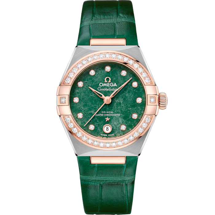 Realizzato in acciaio inossidabile e oro Sedna™ 18K, presenta una lunetta con pavé di diamanti e un datario a finestrella a ore 6. Le lancette, gli indici delle ore, il logo OMEGA e la stella Constellation sono in oro Sedna™ 18K.