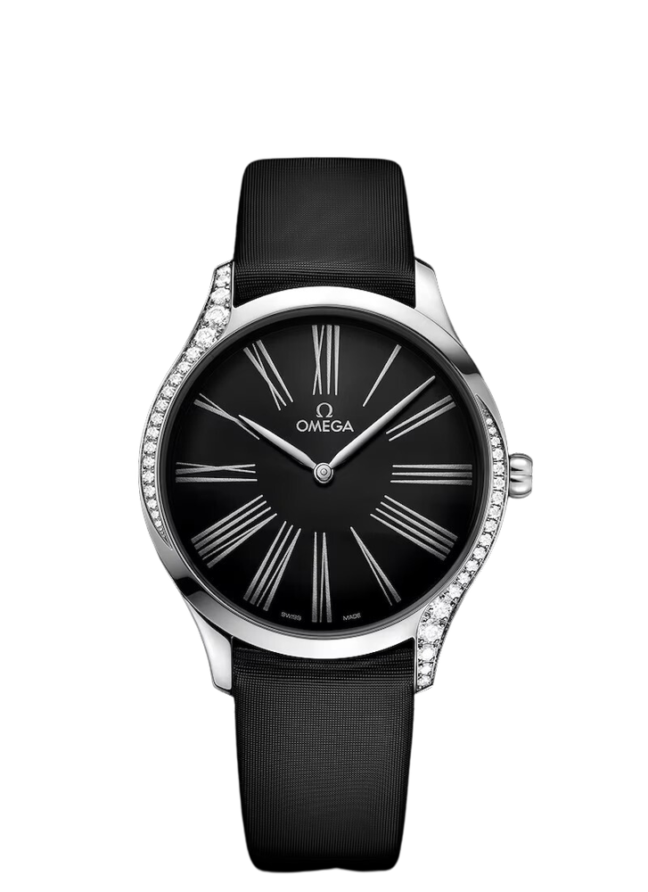 L’orologio è animato dal calibro OMEGA 4061, protetto dallo speciale fondello a specchio con motivo "Her Time”. Infine l'orologio è corredato da un cinturino in tessuto nero.