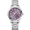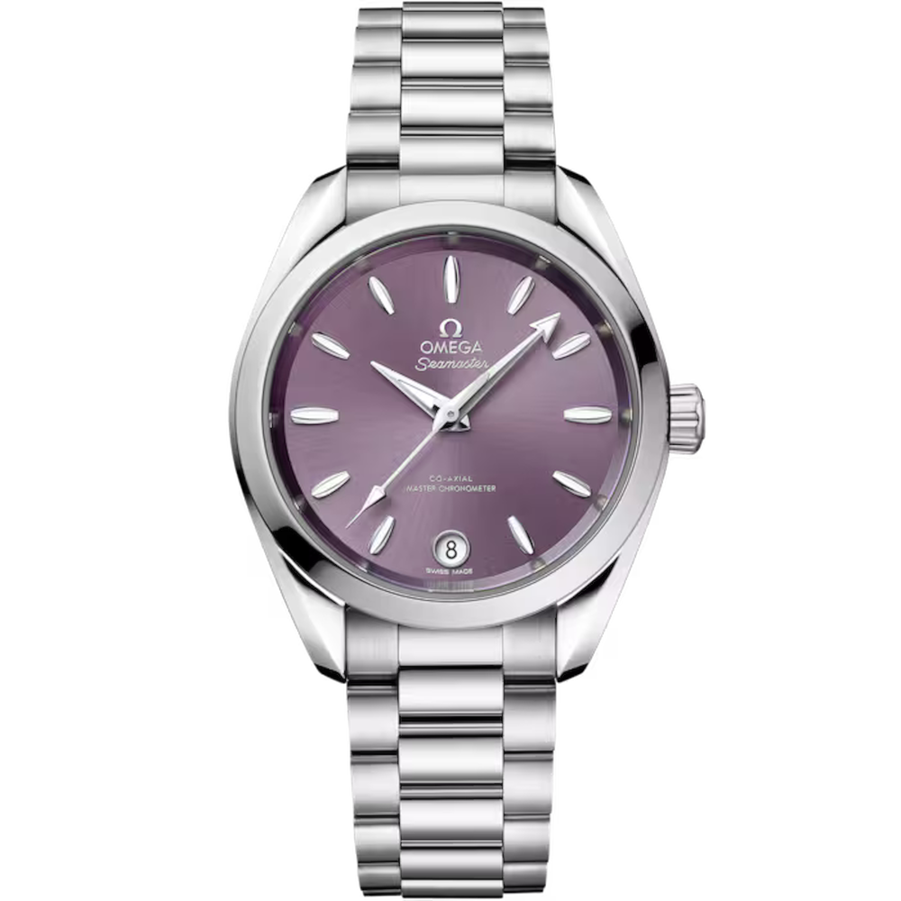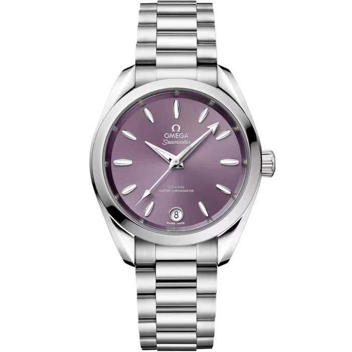 Il quadrante lavanda, realizzato in ottone, è laccato e spazzolato a raggi di sole a partire dal centro. Il datario a ore 6, le lancette, gli indici e il logo OMEGA sono in oro bianco 18K diamantato.