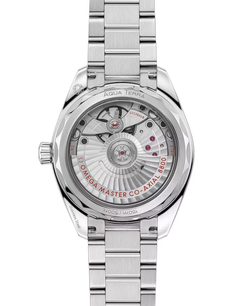 Il Seamaster Aqua Terra è un eccezionale tributo alla ricca tradizione marittima di OMEGA. Questo modello da 34 mm presenta una cassa e una corona simmetrica realizzate interamente in acciaio inossidabile lucido, con il fondello caratterizzato da un design con bordo ondulato.
