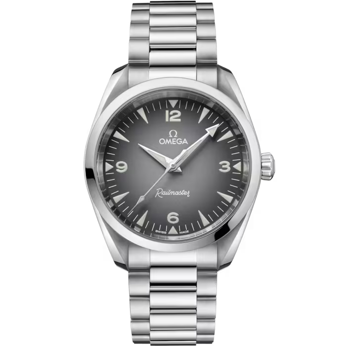 La cassa simmetrica da 38 mm è lucida e spazzolata, e corredata da un bracciale integrato con regolazione comfort e maglie lucide e spazzolate. Nel rispetto dei codici di design del Railmaster originale, il quadrante di facile lettura è color grigio con sfumature nere e presenta numeri grandi e indici delle ore in Super-LumiNova bianca.