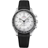 Questo Moonwatch da 42 mm in acciaio inossidabile presenta quadrante e fondello in vetro zaffiro. Ispirato allo Speedmaster di 4a generazione indossato sulla luna, il modello si distingue inoltre per la cassa asimmetrica, il quadrante laccato bianco con indici e logo OMEGA applicati, lancette stile “Moonwatch”, e il celebre indice “Dot over 90” posto sull’anello della lunetta in alluminio anodizzato nero.