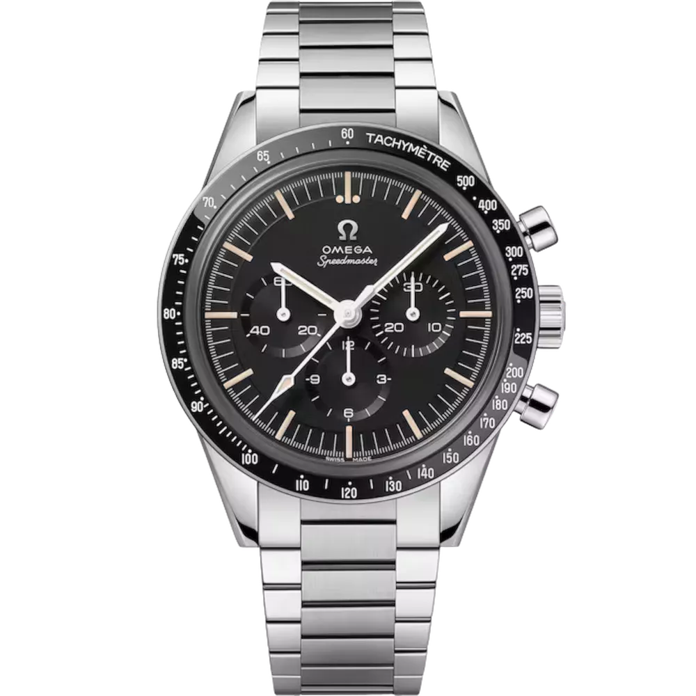 L'iconico OMEGA Speedmaster, protagonista di tutte e sei le missioni lunari, è un orologio leggendario ispirato al celebre Calibro 321, una pietra miliare nella storia delle esplorazioni spaziali. La cassa in acciaio inossidabile da 39,7 mm richiama il design della terza generazione, indossata durante la prima passeggiata spaziale americana nel 1965. La lunetta in ceramica nera lucida con scala tachimetrica in smalto bianco conferisce un tocco di eleganza e resistenza. Il quadrante nero “step” con lancette Moonwatch tradizionali e logo vintage OMEGA è dotato di contatori per i piccoli secondi, i 30 minuti e le 12 ore, oltre alla lancetta cronografica centrale. Il movimento a carica manuale Calibro 321, visibile attraverso il fondello in vetro zaffiro, offre una riserva di carica di 55 ore. Il vetro zaffiro antigraffio con trattamento antiriflesso protegge il quadrante, mentre la resistenza all’acqua fino a 5 bar (50 metri) lo rende adatto all’uso quotidiano. Con una distanza fra le anse di 19 mm, una lunghezza ansa a ansa di 48 mm, uno spessore di 13,7 mm e un peso di 128 grammi, questo modello unisce storia, tecnologia e stile in un unico orologio.