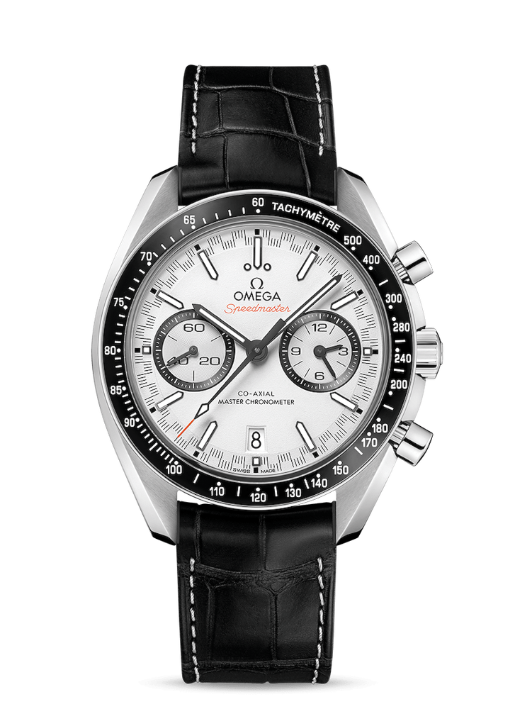 Questo Speedmaster Racing Master Chronometer presenta una cassa da 44,25 mm in acciaio inossidabile su cinturino in pelle nera con lunetta in ceramica nera che include la famosa scala tachimetrica riempita di smalto bianco.