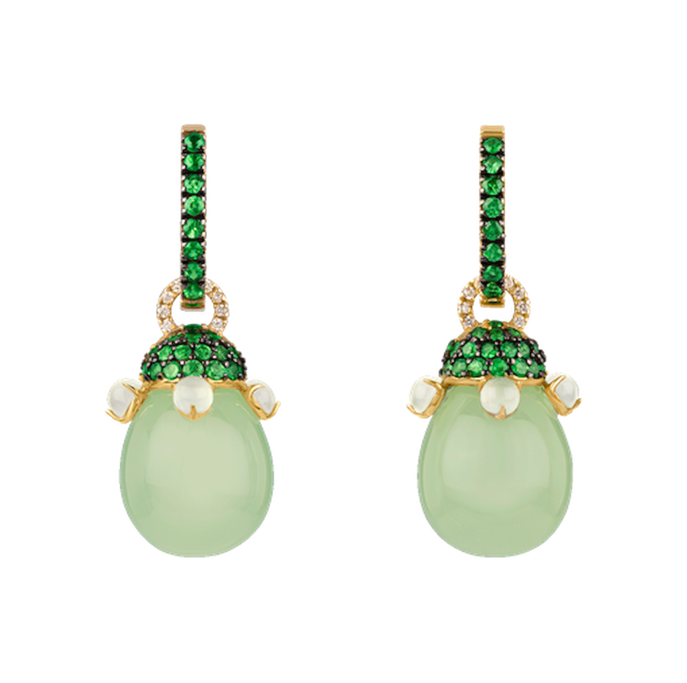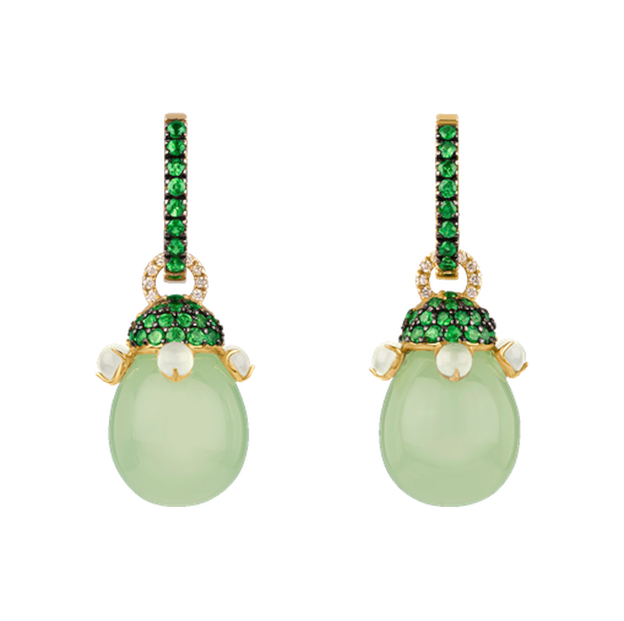 Orecchini Joyful in oro giallo 18Kt, diamanti, tzavoriti e poire in cristallo color verde mela.